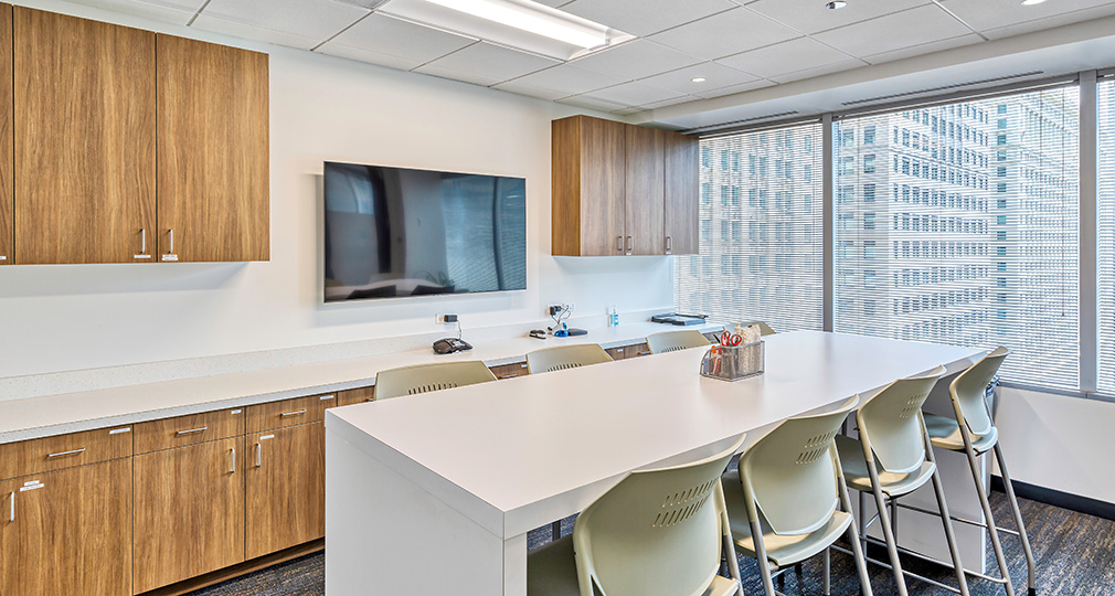 The mission of The Chicago Public Education Fund (the Fund) is to improve education and student achievement in the City of Chicago’s Public schools by supporting principals and teachers by providing the necessary tools for successful student outcomes. When seeking new office space, the Fund required a flexible environment for hosting on site principal/teacher seminars and an environment for all Fund staff that would foster a democratic approach to access to natural daylight. Most staff sit in low-height workstations near the windows while private offices are internalized and provided with glass fronts to allow unobstructed views to the glass line. A wide range of collaboration areas are provided throughout the spaces ranging from small phone rooms for two, a “pit area” for impromptu group interaction, and a conference area with telescoping walls enabling three conference rooms to be combined into one large conferencing space. Bold graphics throughout the space remind staff and visitors about their important mission – it’s all about the students.